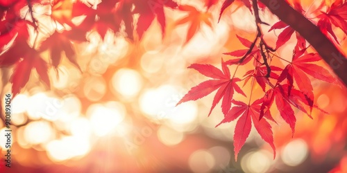 Beautiful autumn background with red maple leaves and blurred bokeh light leaf sunlight nature.