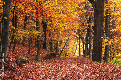 Beautiful autumn forest with yellow-red colors, fallen leaves