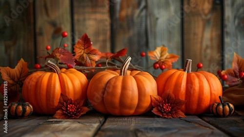 Beautiful autumn halloween pumpkin arrangement placed on a historic wood background