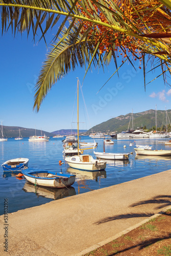 Beautiful autumn Mediterranean landscape with fishing boats on water. Montenegro, Adriatic Sea, Bay of Kotor near Tivat city