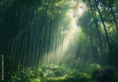Beautiful bamboo forest in China, sunlight shining through the dense green leaves of tall trees