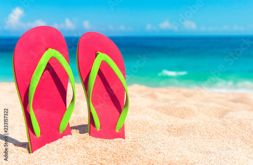Beautiful beach. Beach sandals on the sandy coast. Summer holiday and vacation concept. Tropical beach.