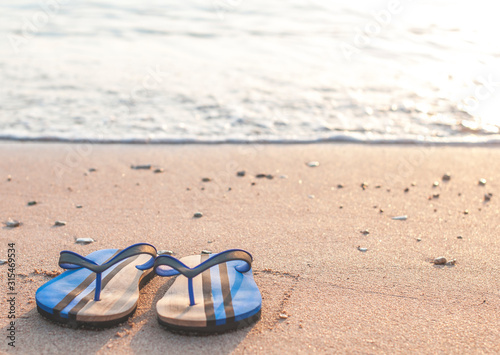 Beautiful beach flip flops on the beach under the wave, on a blurred background, closeup.
