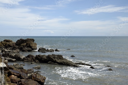 sea, beach, ocean, water, coast, rock, sky, wave, rock, blue, nature, landscape, shore, wave, stone, sand, coastline, bay, cliff, summer, sun, day, cloud, surf, cloud