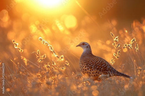 Beautiful Bird Standing in Golden Grass During Sunrise or Sunset