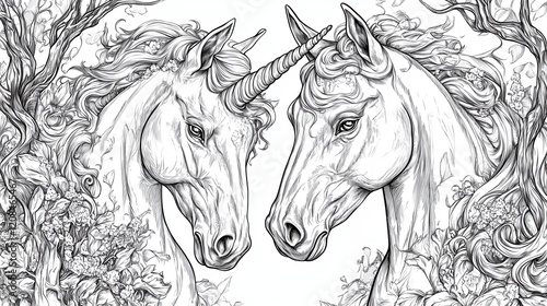 black, white, forest, scene, mythical, magical, creature, horse, fantasy, detailed, illustration, nature, whimsical, vignetting, intricate, drawing, symmetric, enchanting, floral, leaf, horn, mane, majestic, elegant, mystical, artwork, design, branch, imaginative, wonder, artistic, monochrome, tree, background, aethereal, legendary, timberland, animal, wonders, creativity
