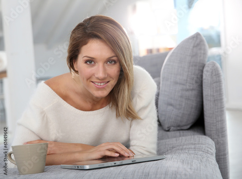 woman, charming, attractive, blond, home, sofa, couch, relaxed, relaxing, relaxation, tablet, cyberspace, websurfing, digital, pad, pda, computer, electronic mail, entertainment, single, tranquil scene, lifestyle, adult, middle-aged, pretty, beautiful, long hair, 30s, 40s, european, people, smile, smiling, indoor, modern, female, girl