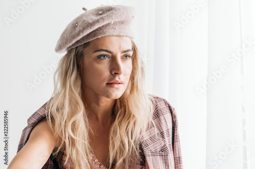 Beautiful blonde fashion woman in brow checked dress. Trendy young woman in shabby chic white interior.