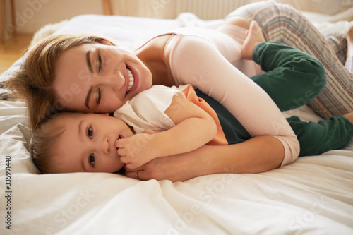 Beautiful blonde female smiling broadly lying on undone bed and embracing awakened toddler son. Cozy sweet shot of cute mom and little child bonding in bedroom. Family, love, care and affection
