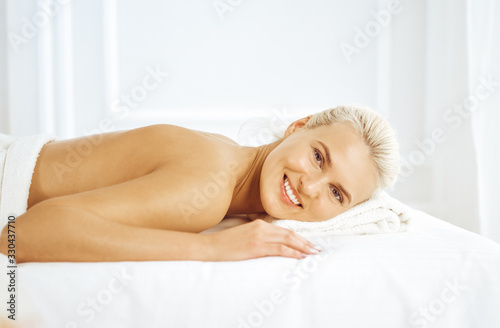 Beautiful blonde woman enjoying back massage with closed eyes. Spa salon concept