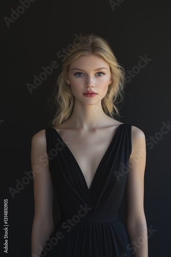 Beautiful blonde woman in black dress. Pictorial feel. Model.