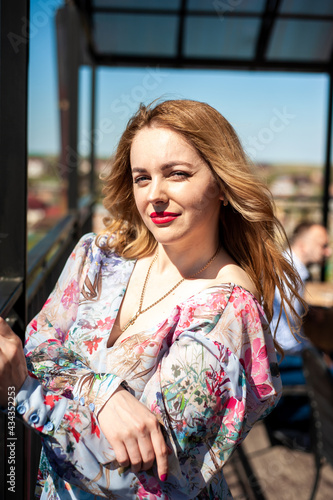 Beautiful blonde woman outdoor summer portrait wearing light dress