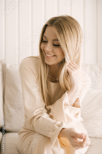 woman, adult, indoor, happiness, female, portrait, beauty, person, smiling, lifestyle, horizontal, one person, photo, beautiful woman, home, blonde hair, house, adults only, carefree, comfortable, confidence, living room, relaxation, room, blond, interior, hair, attractive, casual clothes, cheerful, casual attire, resting, young adult, beige, color image, looking, charming, background, beautiful