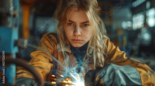 beautiful, blond, woman, use, weld, torch, industrial, workshop, protective, gear, uniform, fabrication, material, technician, jacket, solder, apron, helmet, practice, profession, machinery, personal, technique, supply, manufacture, equipment, clothing, metal