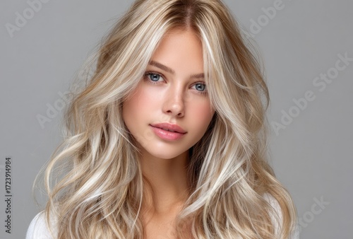 beautiful blonde woman with long hair posing on a gray background