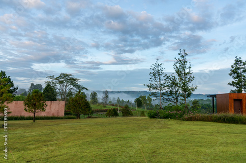 beautiful blue sky high peak mountains mist fog wildlife green forest at Khao Koh, Phu Tub Berk, Phetchabun, Thailand guiding idea long weekend for backpacker camping campfire relaxing hiking