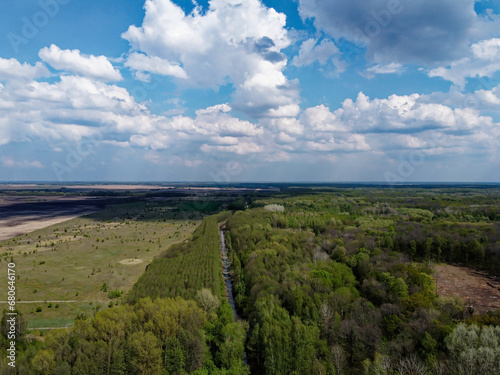 Beautiful blue sky over woodland, aerial view. Agricultural land.