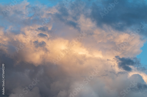 beautiful blue sky with clouds, nature background, film grain noise effect