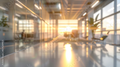 Beautiful blurred background of a light modern office interior with panoramic windows and beautiful lighting.