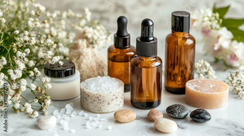 Beautiful bottles of cosmetic products, sea salt, stones, soap, and flowers are arranged on a white marble table.