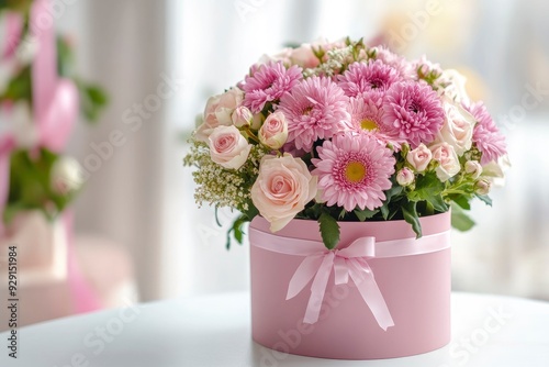 Beautiful bouquet of rose and chrysanthemums flowers and pink gift box on white table background. Gift for holiday, birthday, Wedding, Mother's Day, Valentine's day, Women's Day. with generative ai