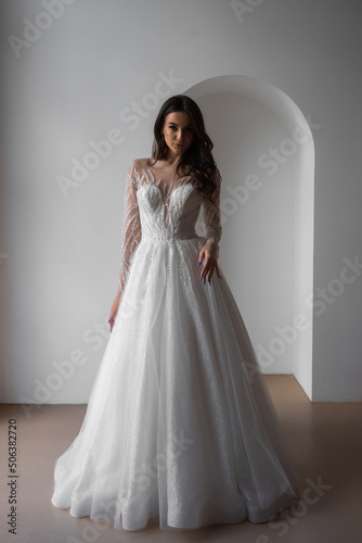 Beautiful bride in a magnificent white wedding dress of tulle with corset lacing and long beauty hair