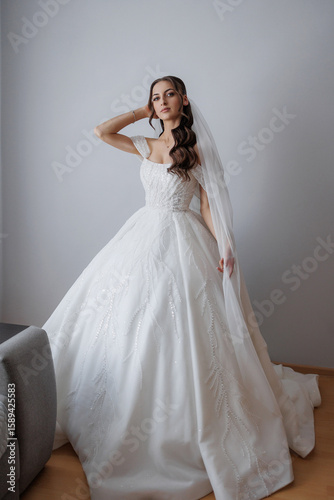 bride, wedding, dress, gown, indoor, posing, beauty, elegance, modern, venue, bridal, portrait, natural, light, coiffure, fashion, ceremony, styling, accessory, love, celebration, romance, modelling, happiness, joy, femininity, chic, luxurious, fabric, tailoring, veil, atmosphere, expression, hair, soft, lighting, detail, personality, intimate, space, contemporary, preparation, event, special, occasion, ritual, portraiture, aesthetic, decor