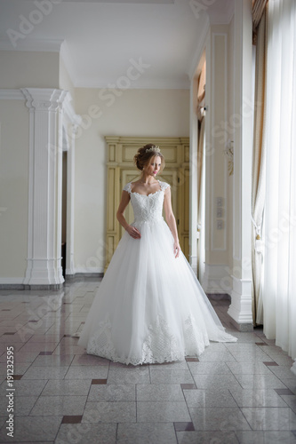 Beautiful bride in wedding dress before wedding ceremony in great hall