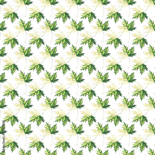 Beautiful bright graphic tender herbal floral autumn green and yellow maple leaves pattern watercolor hand illustration. Perfect for textile, wallpapers, wrapping paper, greetings card