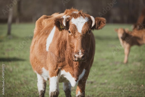 Beautiful brown and white cow stands in a lush green field on a sunny day