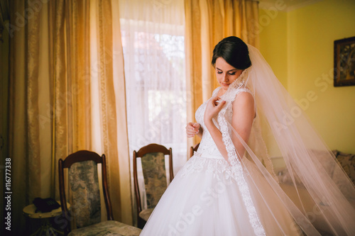 Beautiful brunet bride in white wedding dress standing at her bedroom near the window. Morning bride preparation.