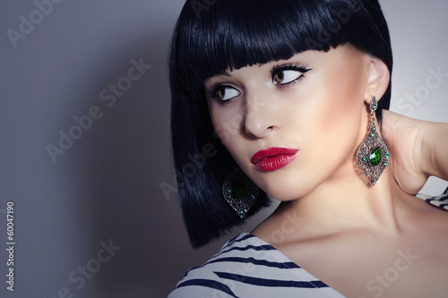 Beautiful Brunette Girl. Bob Haircut. Beauty woman jewelry