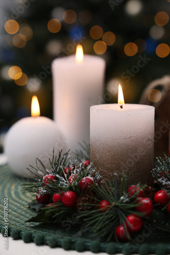 Beautiful burning candles and Christmas decor on white table against festive lights