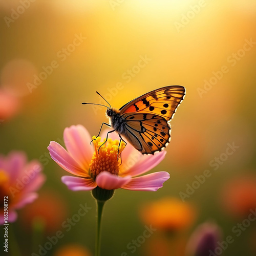 butterfly, flower, pink flower, orange butterfly, golden light, sunrise, sunset, nature, beauty, wildlife, insect, macro, closeup, floral, garden, outdoors, summer, spring, peace, serenity, calmness, warm colors, soft focus, beautiful, delicate, vibrant, spring flower, summer flowers, organic, harmony, natural light, beautiful nature, golden hour, natural beauty, insect, pollination, gardening, calm, peaceful, springtime