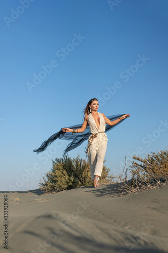 Beautiful caucasian female model dressed in oriental closes, belly dancer like, outdoor in a desert