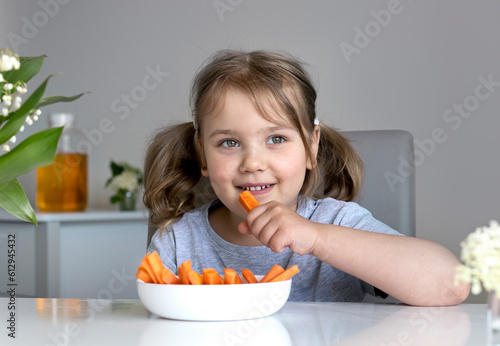 Beautiful caucasian girl eating carrots. Kid's healthy nutrition concept. Little child eating fresh vegetables.