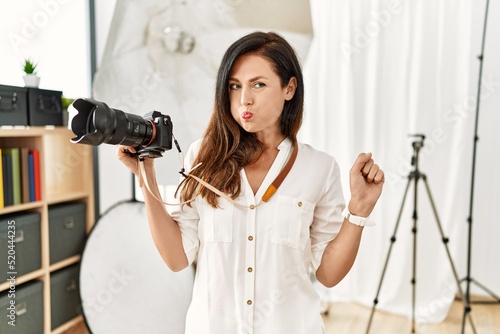 Beautiful caucasian woman working as photographer at photography studio puffing cheeks with funny face. mouth inflated with air, crazy expression.