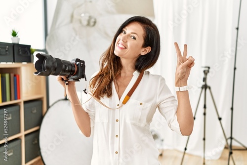 Beautiful caucasian woman working as photographer at photography studio smiling looking to the camera showing fingers doing victory sign. number two.