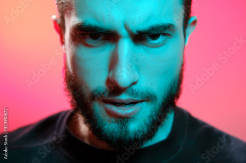 Beautiful caucasian young man portrait isolated on multicolored neon light backgroud. Young, smiling, surprised, screaming. Human emotions, facial expression concept. Trendy colors.Advertising concept