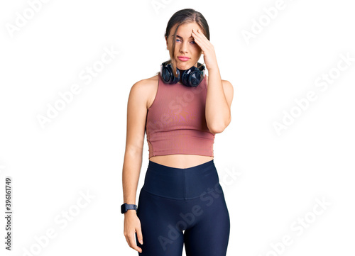Beautiful caucasian young woman wearing gym clothes and using headphones worried and stressed about a problem with hand on forehead, nervous and anxious for crisis