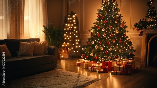 Beautiful Christmas tree with ornaments, lights, presents in cozy living room. gentle lighting, festive holiday spirit.