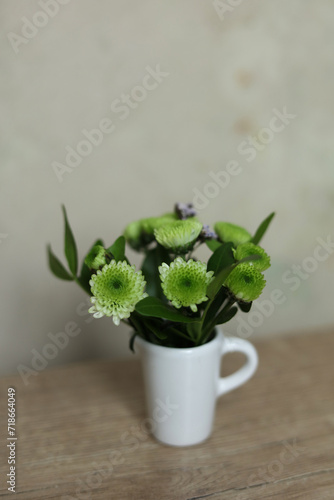 Beautiful Chrysanthemums flowers in a white cup on a wooden table, selective focus