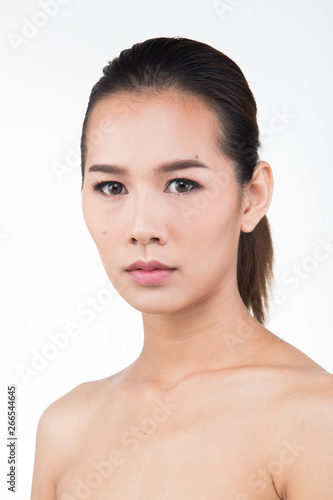 Beautiful Clean Skin Asian Woman straight black hair hands arms fingers face pose open shoulder smile, studio lighting white background copy space, advertising skincare product aesthetics treatment