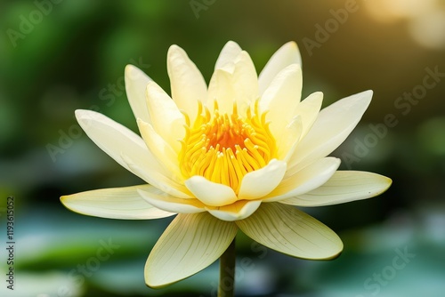 Beautiful close-up of a pristine water lily bloom showcasing delicate white petals and vibrant yellow stamens basking in soft sunlight, surrounded by lush green foliage.