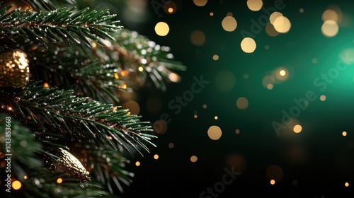 Beautiful close-up of pine tree branches with shimmering gold decorations, accompanied by artistic bokeh lights, celebrating the spirit of festive traditions.