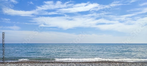 beautiful clouds in the summer sky, cirrus clouds over the sea. Calm sea and beautiful sky on a sunny day