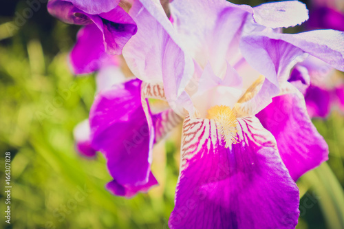 Beautiful colorful violet and yellow iris flower blooming. Photo depicts delicate bright.wild fleur-de-luce flower. Close up, macro view.