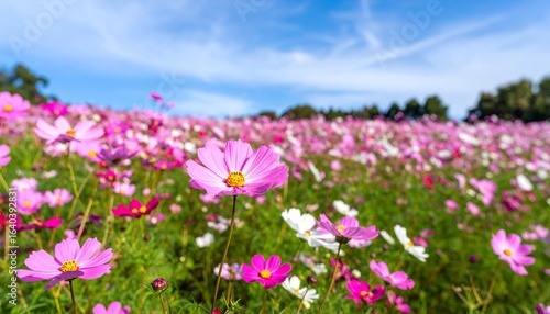 Beautiful cosmos flower field in full bloom against soft blurred background, delicate petals, vibrant colors, serene floral landscape, nature beauty, peaceful and romantic garden scene