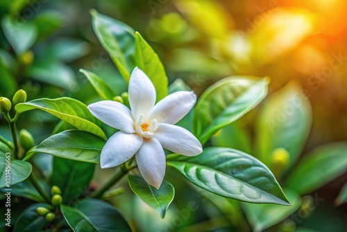 Beautiful crape jasmine flower blooming in garden with green leaves background.