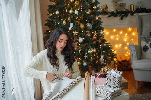 Beautiful dark haired curly woman is packing gift boxes near the Christmas tree in cozy home. Stylish model makes online purchases during the winter holidays. New Year.